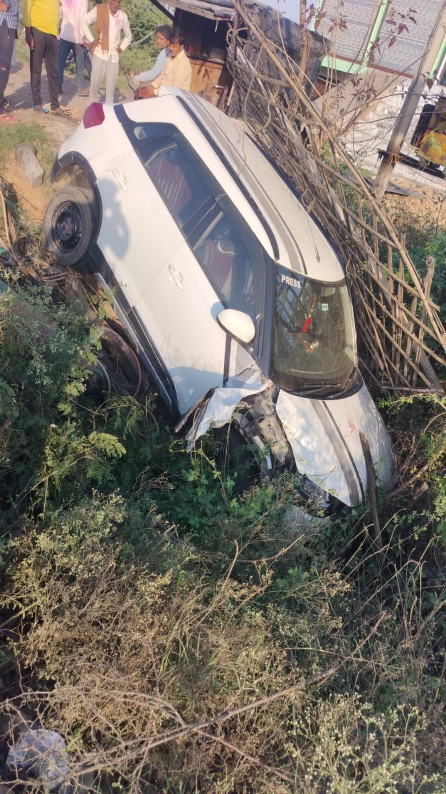 बाइक सवार को बचाने के प्रयास में अनियंत्रित कार खाई में गिरी, पत्रकार का परिवार बाल-बाल बचा।