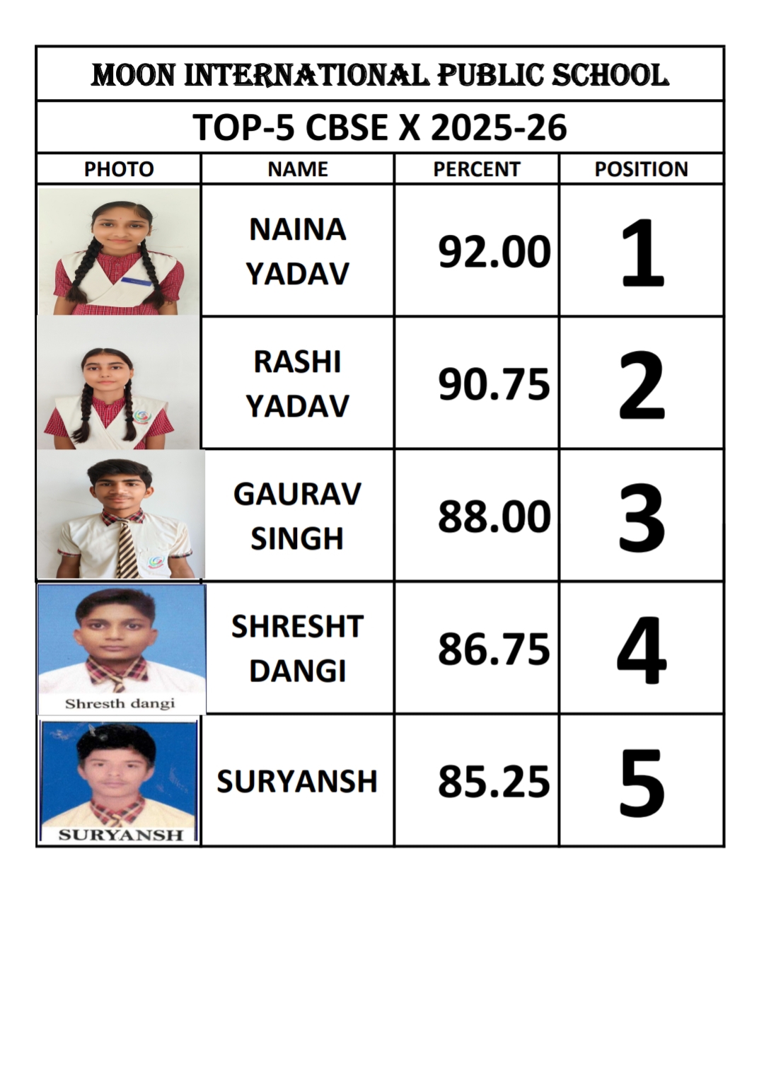मोंठ (झाँसी)। मून इण्टरनेशनल पब्लिक स्कूल भुजोंद(मोंठ) का इस वर्ष सी.बी.एस.ई. बोर्ड कक्षा 10वीं का परीक्षा परिणाम शत-प्रतिशत रहा।