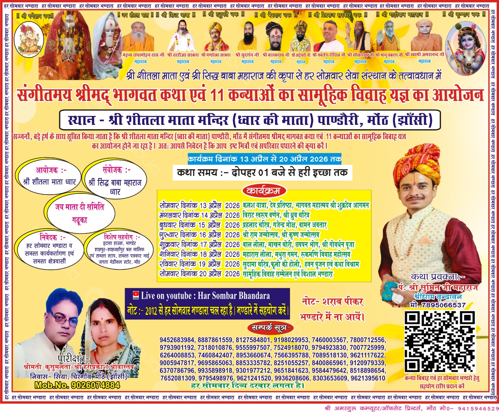 मोंठ = नगर के पांडोरी स्थित श्री शीतला माता मंदिर (ध्वार की माता) परिसर में आगामी 13 अप्रैल से 20 अप्रैल 2026 तक संगीतमय श्रीमद् भागवत कथा एवं 11 कन्याओं के सामूहिक विवाह यज्ञ का भव्य आयोजन किया जाएगा। यह आयोजन श्री शीतला माता एवं श्री सिद्ध बाबा महाराज की कृपा से ‘हर सोमवार सेवा संस्थान’ के तत्वावधान में किया जा रहा है।