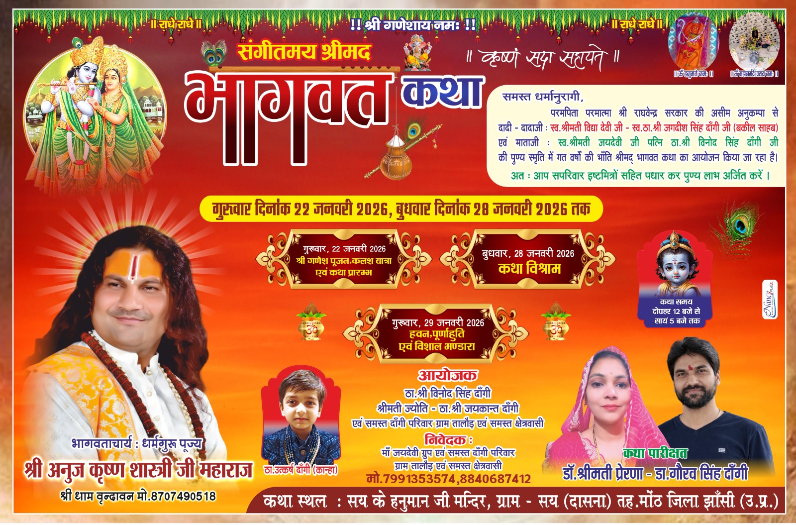 समथर — नगर के आदिशक्ति बीजासेन माता मन्दिर प्रांगढ में संत बालकदासजी महाराज के सानिध्य में ध्वार की माता मंदिर एवं रामगढ़ माता मंदिर के लिये 121 खप्पर जवारे बोये गये है । मंदिर प्रांगढ़ में शतचंडी पाठ एवं श्रीमद भागवत कथा का आयोजन चल रहा है एवं रात्रि में नित्यप्रति भजन गायन हो रहा